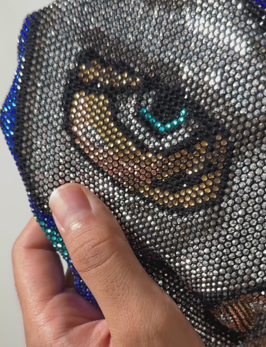 Crafted with our beading technique, the design shines with approximately 20,000 colorful stones, each hand-set into a custom template and heat-applied for brilliance. "Blue Demon Jr 3" is a powerful symbol of tradition, strength, and the enduring spirit of lucha libre.