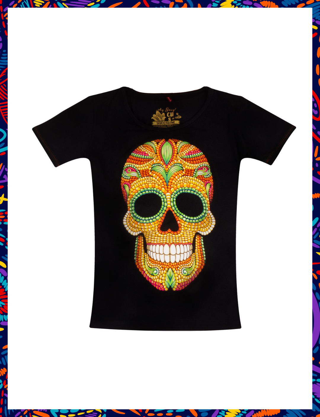 Introducing Elotillo Damas, a colorful design that merges the symbolism of the skull with the essence of corn. Representing both the fragility of life and the cycle of renewal, this piece invites reflection on how death gives way to growth. The corn, sacred in Mexican culture, embodies regeneration and hope, even in the face of mortality.