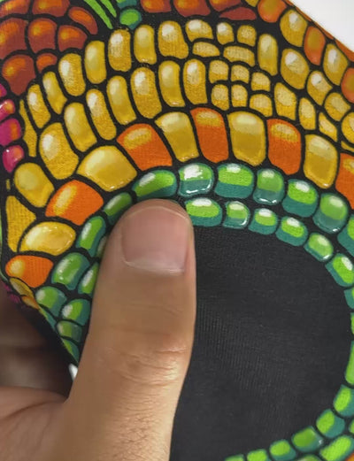 Crafted using 9 bright water-based inks with our corrosion technique, it’s enhanced with transparent gel and a UV effect that makes it glow and shift tones in the dark.