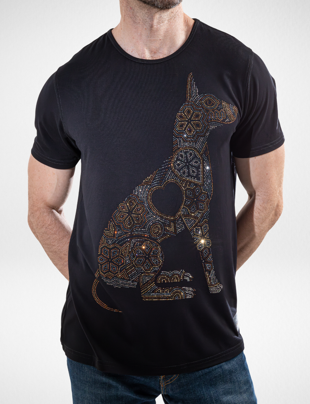 Finished with a rhinestone application, the design gains luminous depth and brilliance, enhancing its visual impact and celebrating the fusion of tradition and contemporary art.