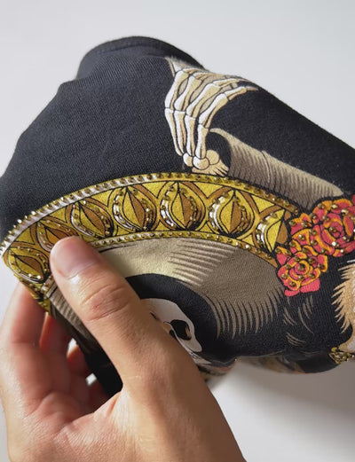 Created with 10 etching inks using screen printing, the piece is heat-finished to bring out every intricate detail. Hand-placed stones, arranged within a single template and bonded with heat, add brilliance and texture. Pa’l Recuerdo is a lively statement of cultural pride and celebration.